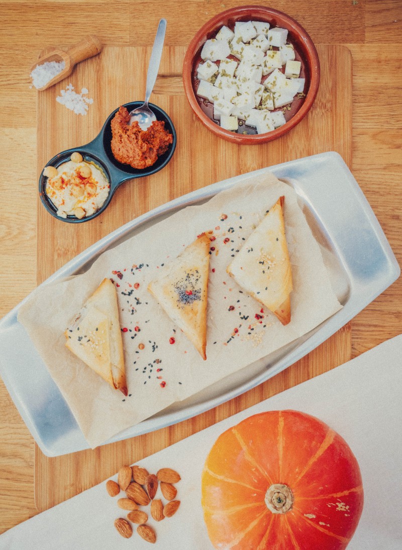 Pasta filo amb el contrast dolç de la carbassa i cruixent de ametlla i el toc del nostre formatge vegetal.