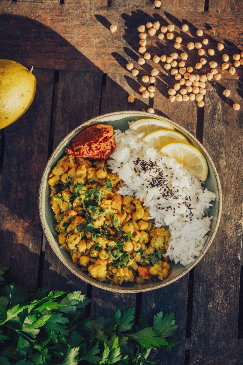 Curry de cigrons amb coco i llimona, verdures de temporada i acompanyat d'arròs basmati.